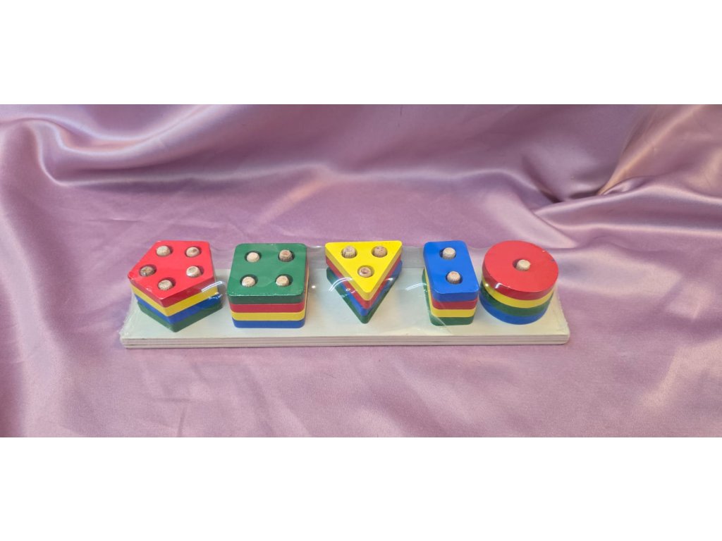 Skládanka obsahuje barevné dílky různých tvarů (kruh, čtverec, obdélník, trojúhelník, pětiúhelník), které se navlékají na kolíčky na dřevěné podložce. Každý tvar má jiný počet otvorů, což dítě učí i počítání a vztahy mezi tvary.