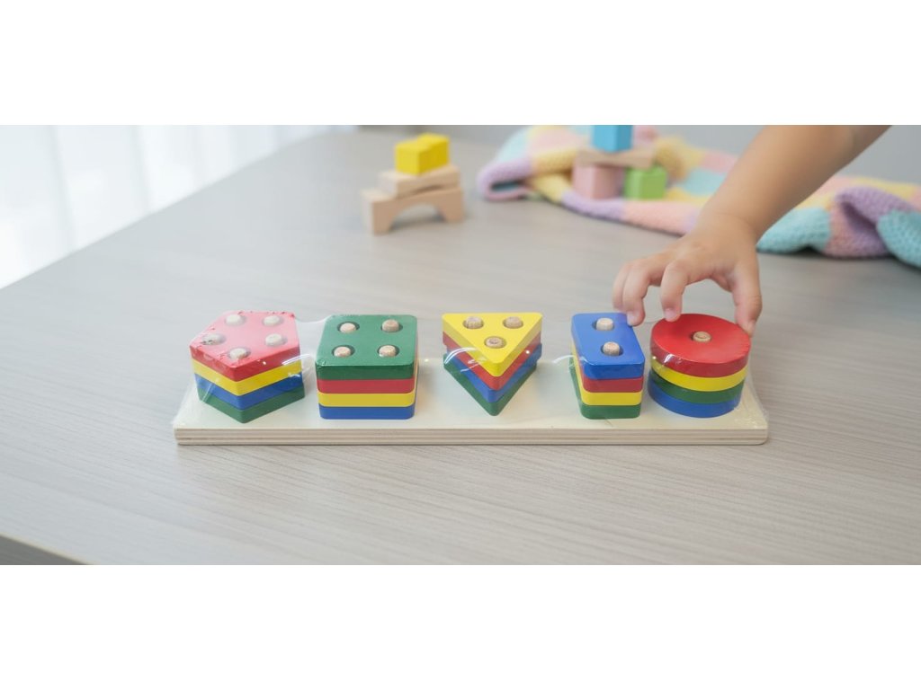 Barevná dřevěná skládanka s různými tvary rozvíjí logiku, motoriku a rozpoznávání barev. Kvalitní dřevěná Montessori hračka vhodná pro děti od 18 měsíců.