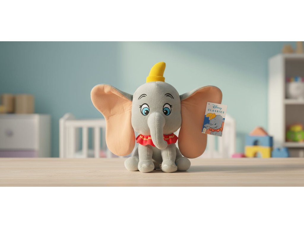 Roztomilý plyšový sloník Dumbo z Disney pohádky okouzlí děti svými obřími uši i veselým zvukem. Hebká plyšová hračka o velikosti 30 cm je ideální na mazlení, hraní i jako kouzelný dárek.